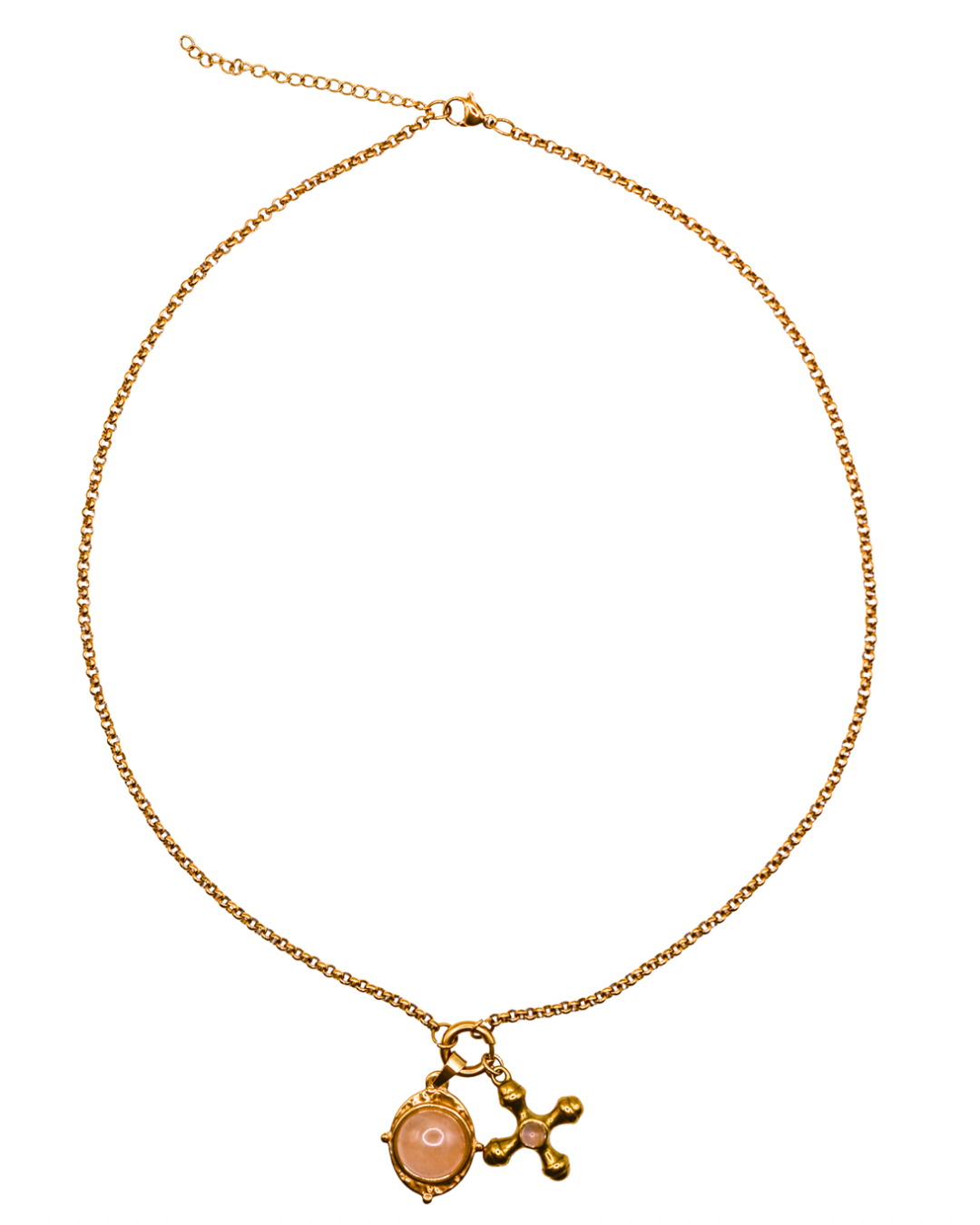 This delicate gold chain holds two quiet treasures: a blush-toned medallion and a cross-shaped charm — both gentle, luminous, and understated. Just like Georgiana Darcy, this necklace reflects a heart that chooses grace and gentle art even when the world feels loud. It’s a piece for the peacemakers, the dreamers despite heartbreak or delay, the ones who know strength doesn’t have to shout.